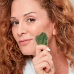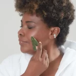 Após a aplicação do sérum, deslize a gua-sha suavemente sobre a pele em movimentos suaves e contínuos.